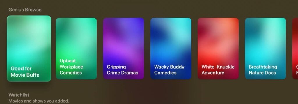 Aprovechando el mecanismo de la función Genius de iTunes o de las recomendaciones «Hecho para ti» en Apple Music, Genius Browse ofrece recomendaciones de programas de televisión y películas a los usuarios. Para poder verlo, está disponible desplazándose hacia abajo en la pestaña Inicio en la aplicación de TV, Podrás ver una variedad de categorías como «Bueno para una cita nocturna» o «Basado en un libro». Estas categorías se actualizan regularmente, y cada una ofrece una lista de títulos para que las revises.