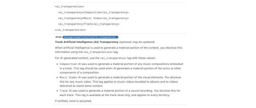 - La etiqueta Track (disponible solo en el nivel de pista) se utiliza cuando la IA genera una parte material de una grabación de sonido.