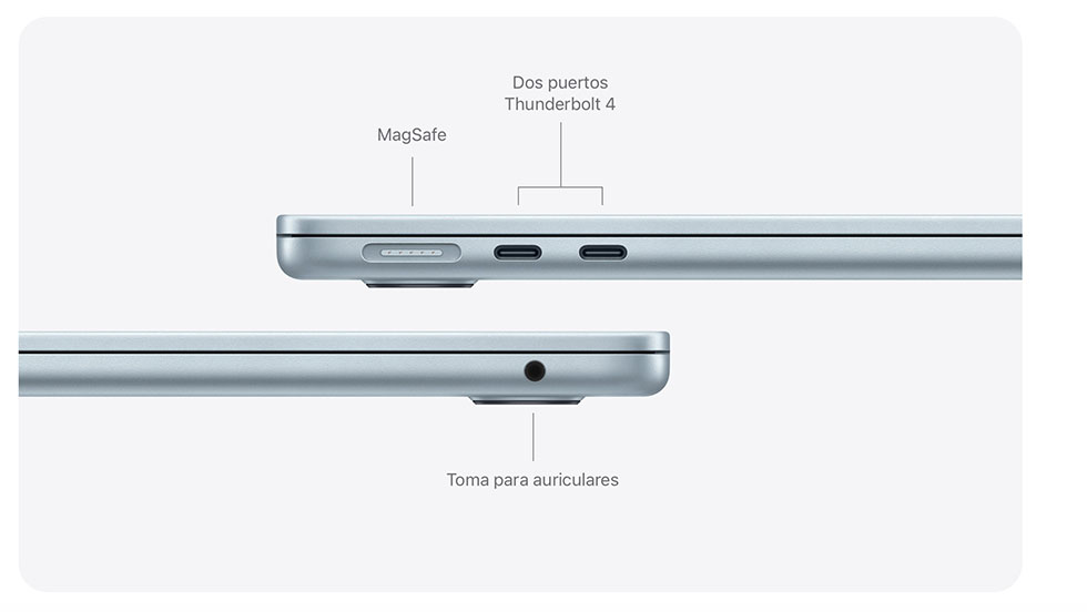 - Conectividad total: El MacBook Air viene con dos puertos Thunderbolt 4 para conectar accesorios y admite hasta dos monitores externos, ideal para profesionales y estudiantes que necesitan ampliar su espacio de trabajo. MagSafe permite una carga exclusiva y garantiza la tranquilidad de los usuarios mientras está conectado a la corriente.