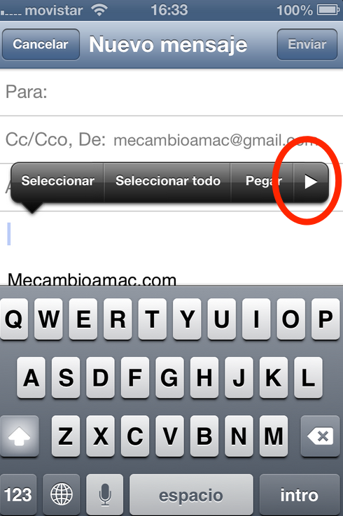 Comprobarás como te aparece una barra negra con unas opciones, seleccionar, Seleccionar todo, Pegar y a continuación una flecha negra, pulsa sobre ella.