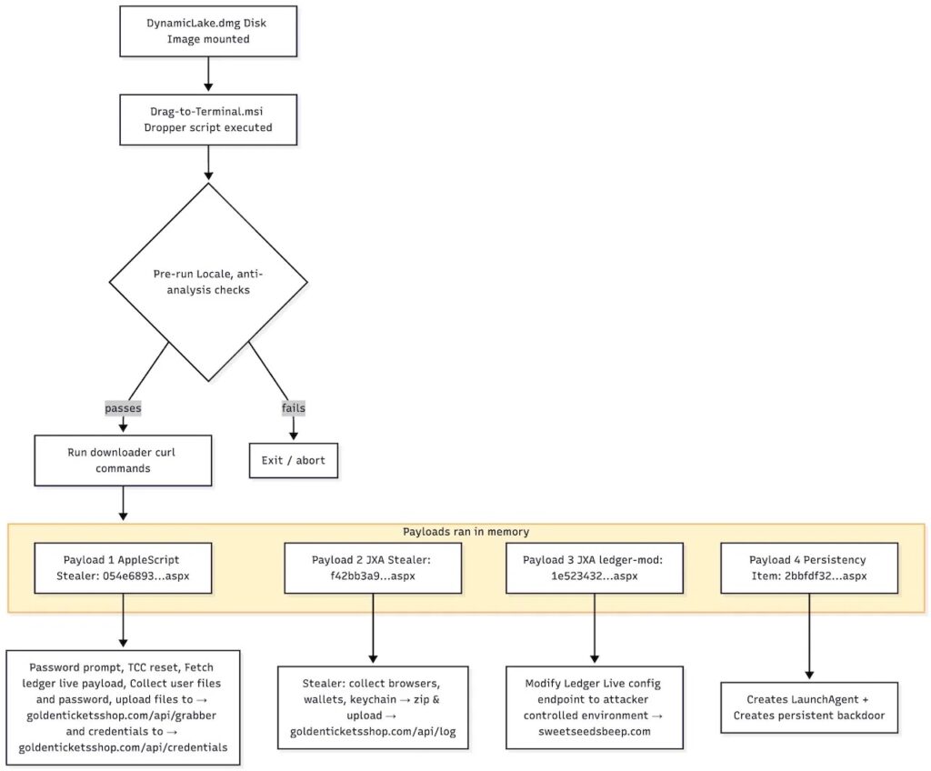 Jamf Threat Labs señala que la muestra de malware se hace pasar por la utilidad legítima DynamicLake (un software que dice ofrecer control intuitivo sobre funciones del sistema, gestión de música y notificaciones inteligentes) para macOS , un software que se utiliza para mejorar la experiencia de usuario y la productividad de la interfaz de Mac. Para evadir la detección, el atacante utiliza el secuestro de nombres de dominio para engañar a los equipos de seguridad durante las revisiones manuales.