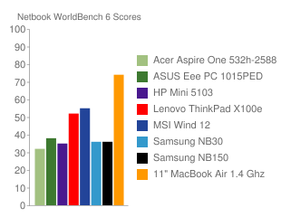 Acaba de realizar una test entre los diversos ultraportatiles que inundan el mercado, se les ha pasado numerosas pruebas, como el tiempo de carga, la grafica,.. bueno lo de siempre y el ganador, alcanzando un 76/100, cuando la media de la prueba esta en 45, a pesar de las criticas que ha recibido ha sido el nuevo MacBook Air de 11.6″, enl grafica de abajo podeis ver el resultado final.