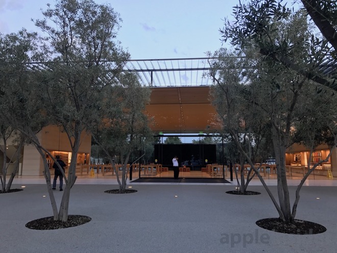 A ambos lados del espacio comercial, hay escaleras de piedra que proporcionan acceso a la cubierta de la azotea, que ofrece una vista sobre el parque de Apple Park. Desde la acera, el enorme anillo de «nave espacial» es sólo parcialmente visible, anidado detrás de bermas de tierra cubiertas de vegetación y árboles. Se puede decir que el edificio es enorme, pero en realidad no se puede ver bien. También es difícil ver más de la parte superior del auditorio Steve Jobs.