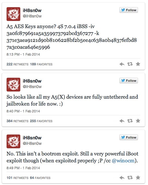 El hacker iH8sn0w ha descubierto un exploit que permite hacer un Jailbreak de por vida a los dispositivos que integren un chip A5 y A5X en sus entrañas, lo acaba de comunicar en su cuenta de Twitter.
