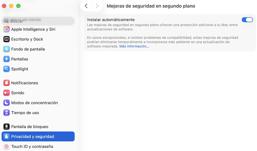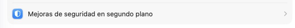 La opción Mejoras de seguridad en segundo plano ofrece versiones de seguridad ligeras para componentes como el navegador web Safari, la compilación del marco WebKit u otras bibliotecas del sistema que se benefician de patches de seguridad más pequeños y continuos entre las actualizaciones de software.