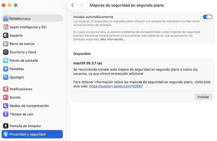 Estos paquetes menores de actualización fueron lanzados con macOS Tahoe 26.1. Los usuarios podemos instalar las mejoras de seguridad en segundo plano ya sea manualmente o automáticamente si la opción correspondiente está habilitada. Si los usuarios deciden no instalar las mejoras de seguridad en segundo plano, las mismas correcciones se incluirán posteriormente en las actualizaciones de software estándar.