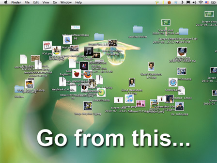 La verdad es que mi escritorio esta bastante bien ordenado, muy minimalista, soy un poco maniatico del orden, pero tengo un par de amigos que son los contrario, asi que, les dedico y recomiendo este post para salvarles un poco la imagen cuando abran su Mac delante de terceros.