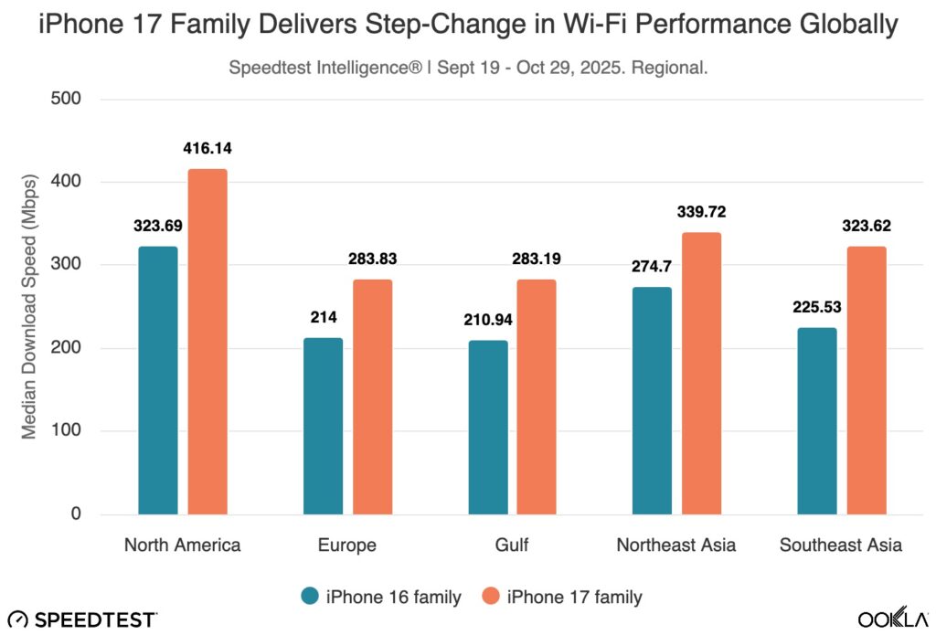 Utilizando datos globales de Speedtest Intelligence® recopilados por crowdsourcing durante las seis semanas posteriores a la llegada a las tiendas de la familia de dispositivos iPhone 17, Ookla comparó el rendimiento del N1 de Apple con su predecesor basado en Broadcom y los principales buques insignia de Android que utilizan silicio Wi-Fi de Qualcomm, MediaTek y Broadcom.