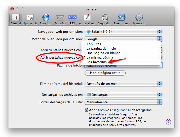 Por defecto cuando abres una nueva pestaña en Safari aparece el Top Sites, si no te interesa mucho y prefieres tener tus favoritos, puedes modificar Safari y poner esta nueva función, para esto sigue la ruta dentro de safari Preferencias > General, alli despliega el menu de Abrir pestañas nuevas con. marca Favoritos
